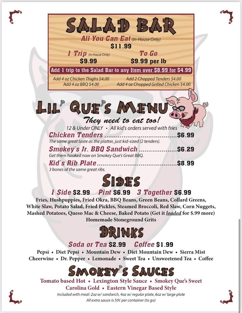 Welcome to Smokey Que's, your go-to destination for mouthwatering American BBQ in Marion, NC! Located at 1700 N Main St, our casual eatery specializes in delicious grilled dishes, local specialties, and a diverse selection of teas. With a range of amenities such as outdoor seating, delivery, and takeout, we cater to everyone, from individuals to families. Enjoy our cozy atmosphere, perfect for lunch, dinner, or a solo outing. Accessible seating and facilities ensure comfort for all. Join us at Smokey Que's for an unforgettable dining experience that celebrates traditional flavors and warm hospitality!